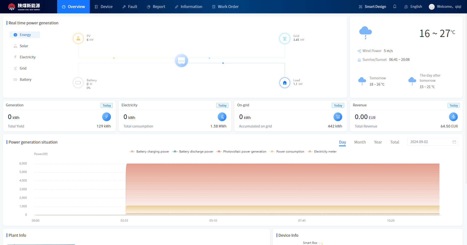 [Day]Display your selected plant today's battery charging power, battery discharge power, photovoltaic power and electricity power, support screening query history records.