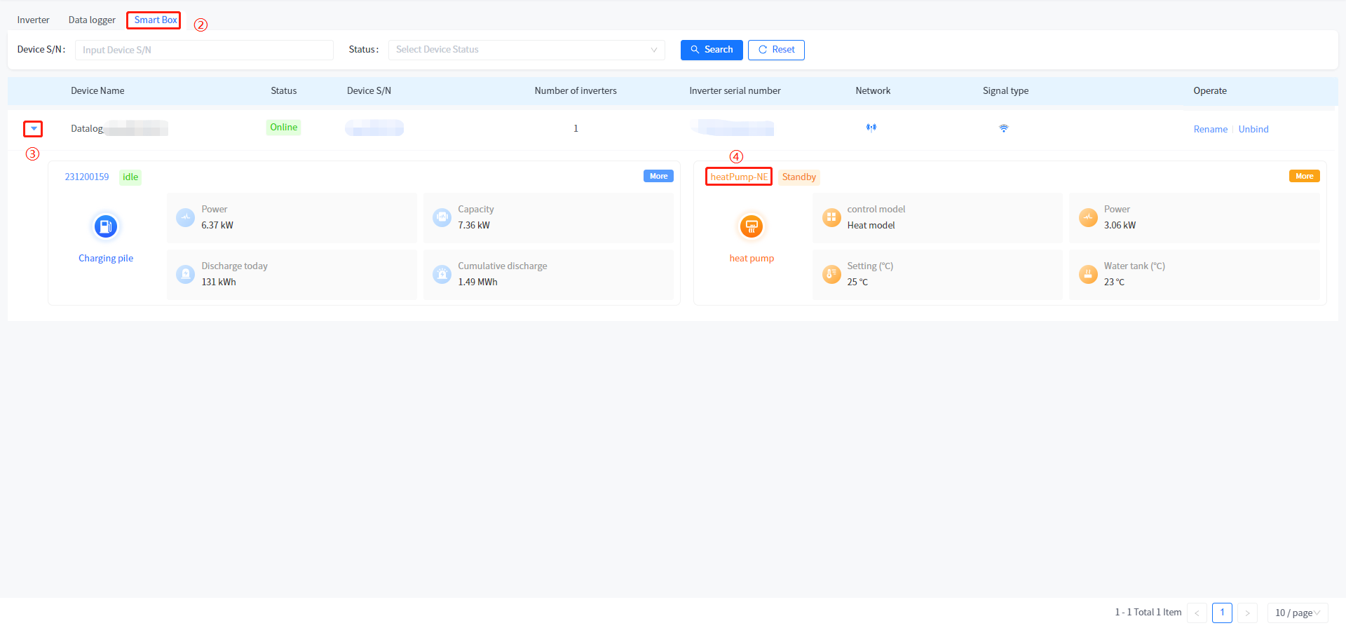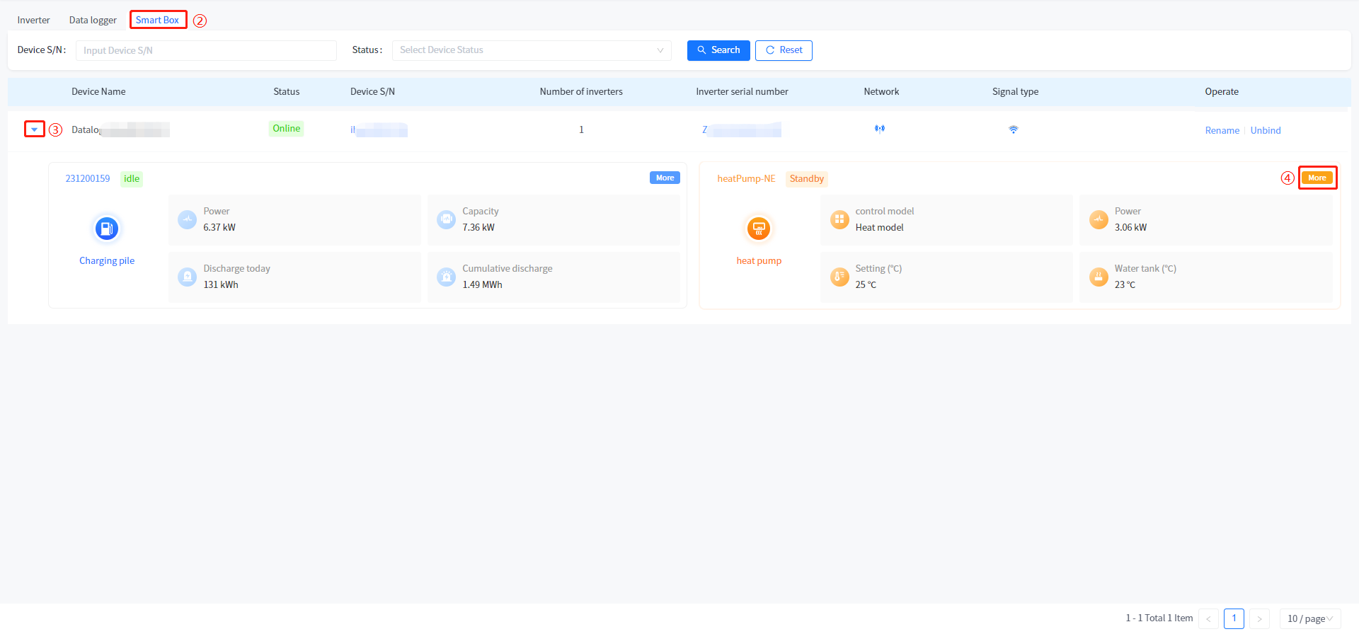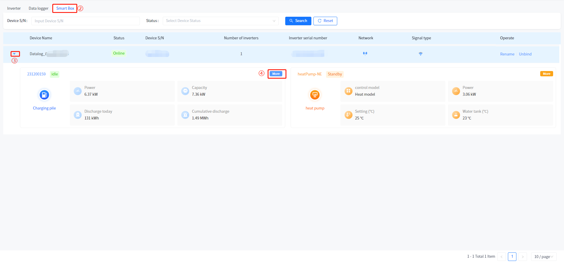 ④ Click the [More] button in the upper right corner of the heat pump summary data to enter the charging pile summary page, or click on the device serial number in the heat pump pile data to directly view the detailed information of the device.