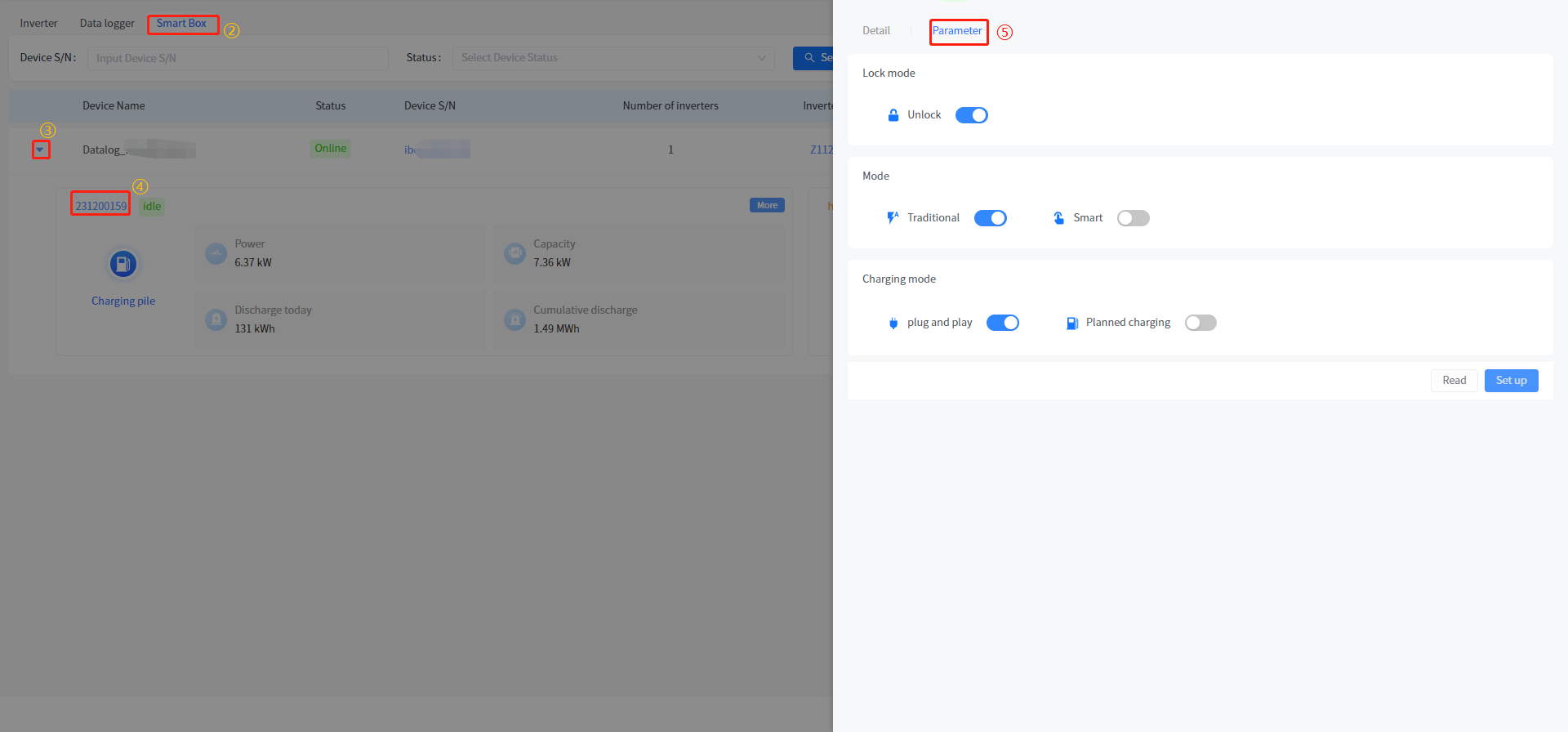 ④ Click on the device serial number in the charging station data to enter the detailed information page of the charging station device.