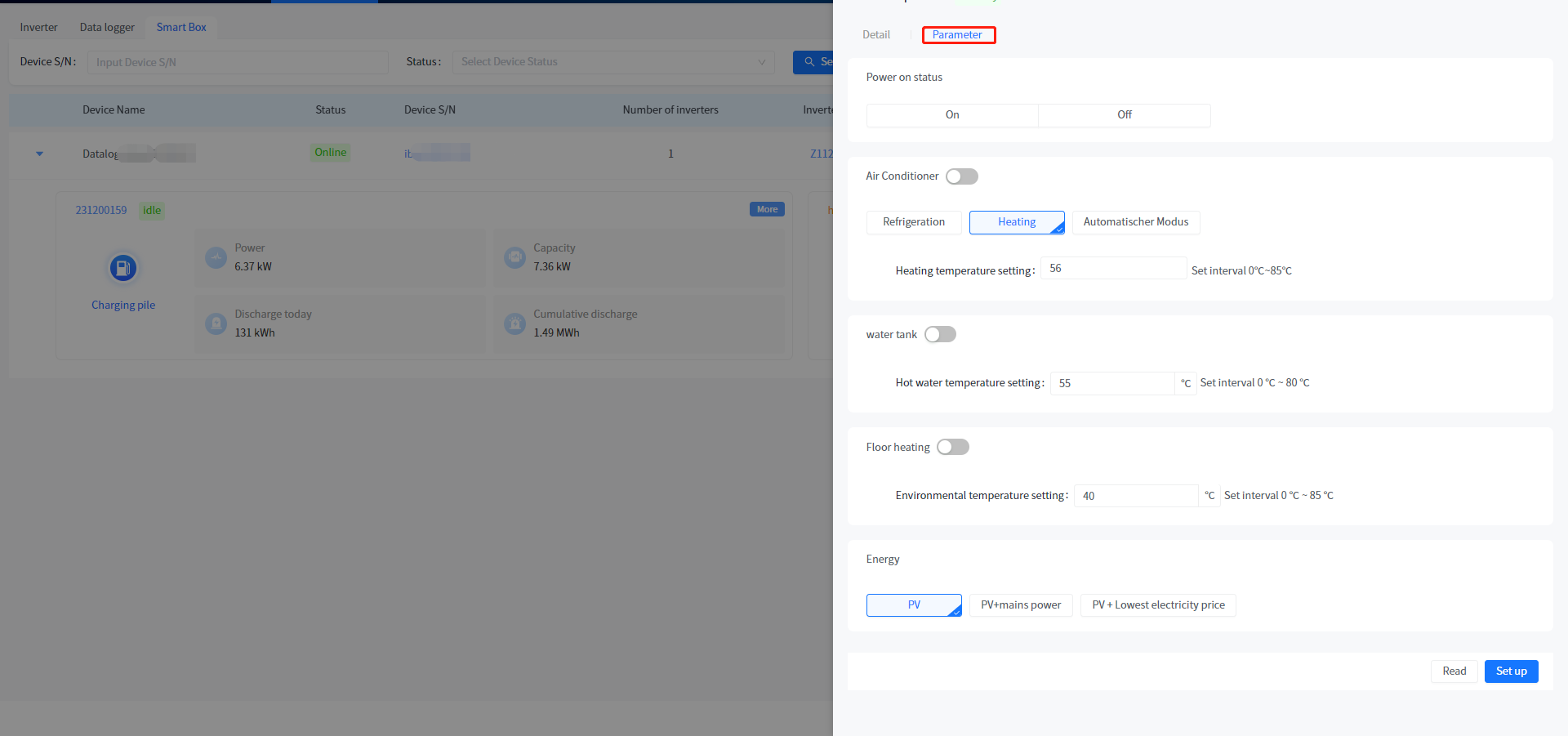 This system supports the addition and association of plants to Smart Box devices, as well as data viewing and parameter configuration of associated heat pump and charging station devices under Smart Box.