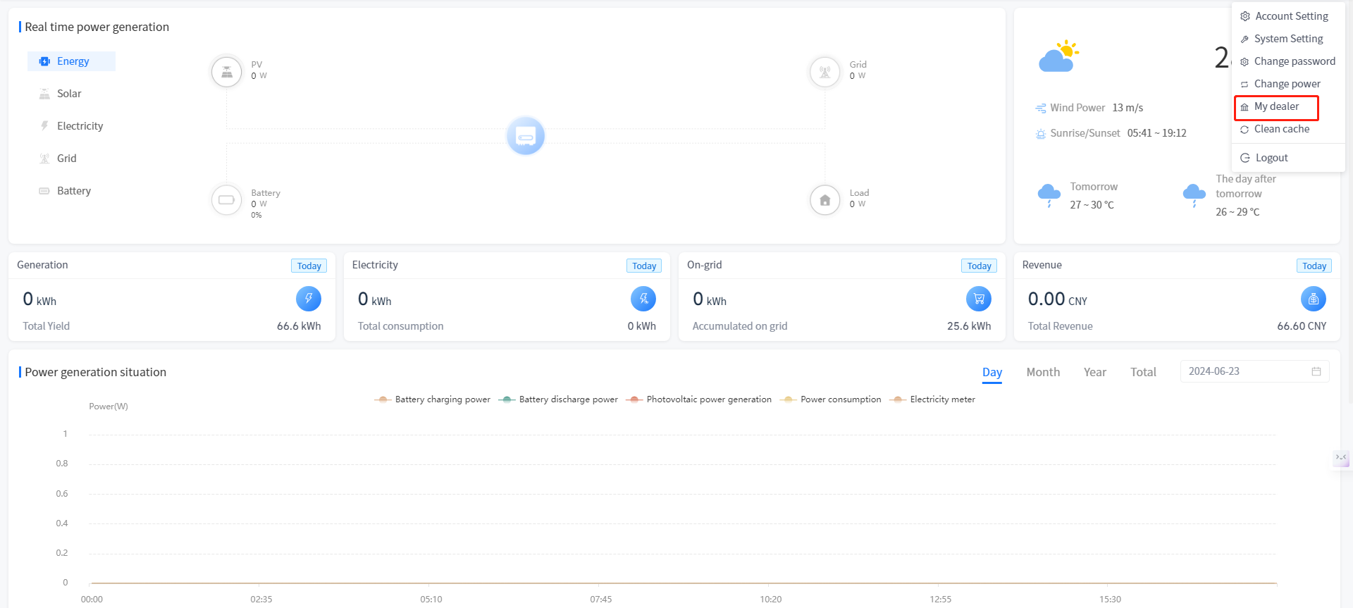 SHAANXI COAL NEW ENERGY Co., Ltd. This system supports the owner to view the contact information of the power plant dealer in the My Dealer pop-up window, and open the pop-up window by clicking the [My Dealer] button in the welcome message in the upper right corner.