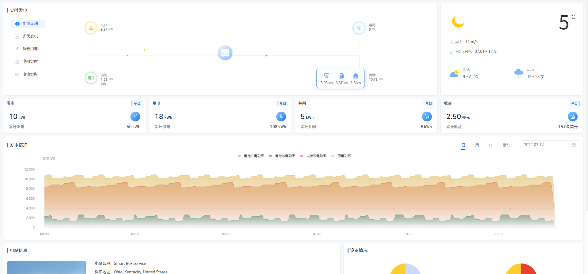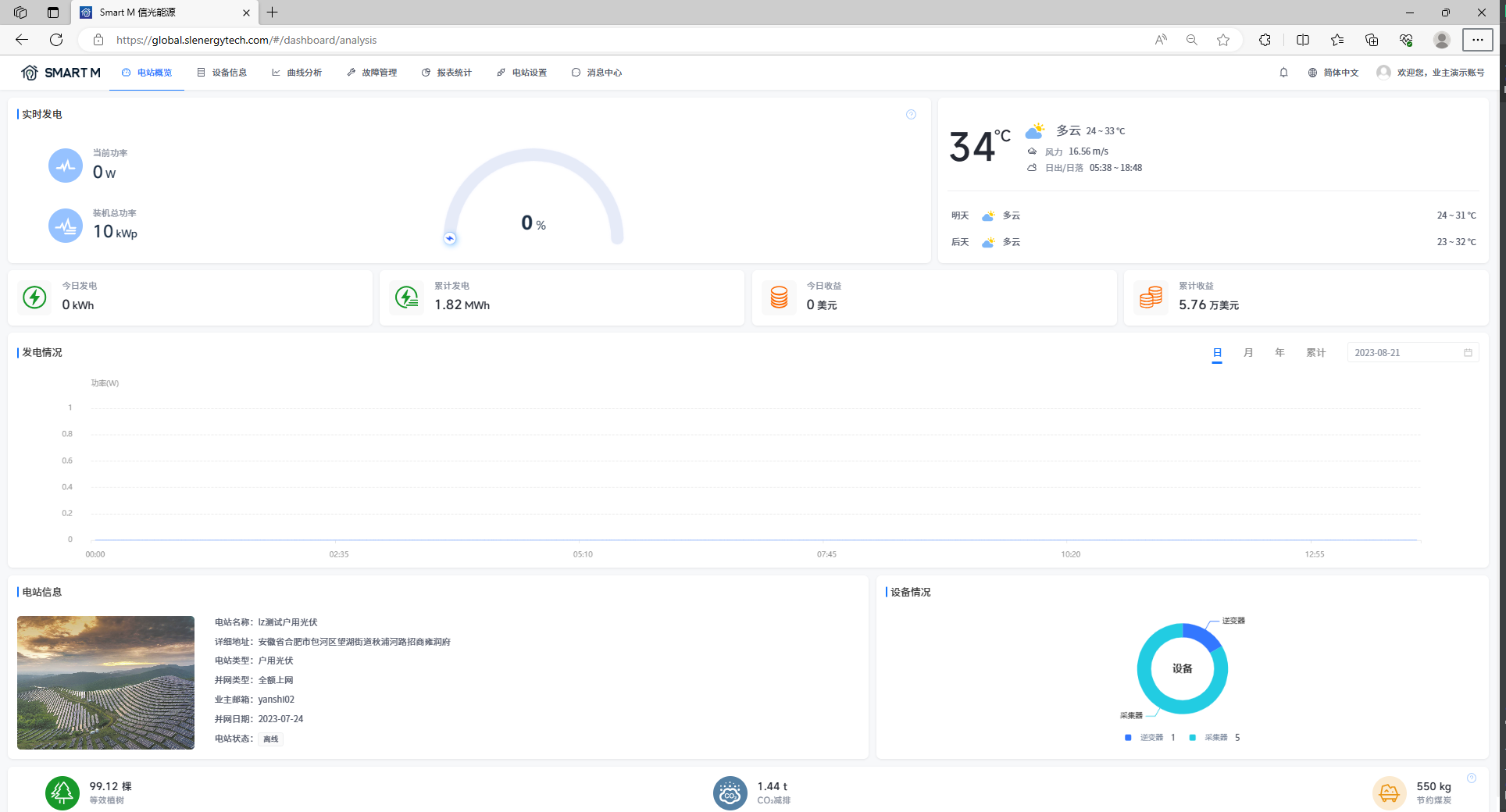 [光伏发电]展示您所选电站光伏发电实时功率和发电量统计情况。