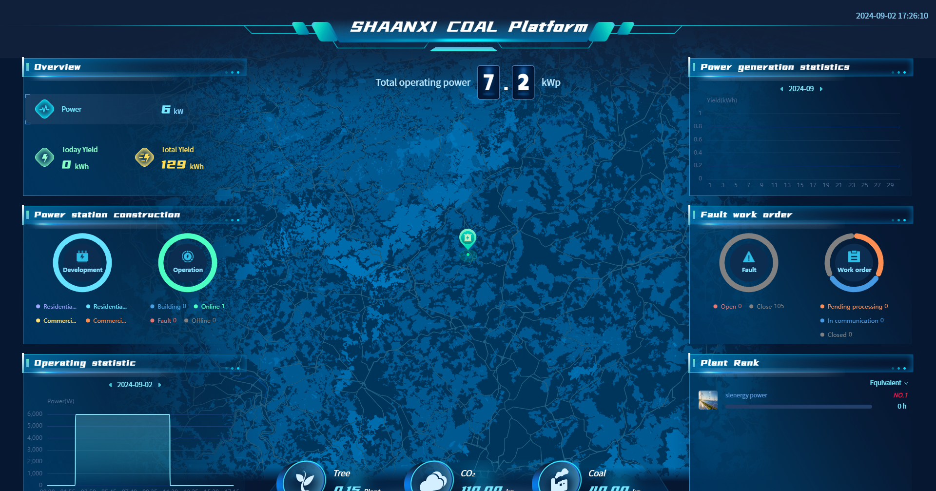 SHAANXI COAL NEW ENERGY provides an intelligent large screen that integrates power plant monitoring, energy management, and data analysis, presenting real-time comprehensive information on power plant operations to help you better control energy management. Through rich data display and analysis functions, you can gain a deep understanding of the operational efficiency, power generation benefits, and energy-saving and emission reduction effects of power plants, while monitoring the status of power plants and faults worldwide.