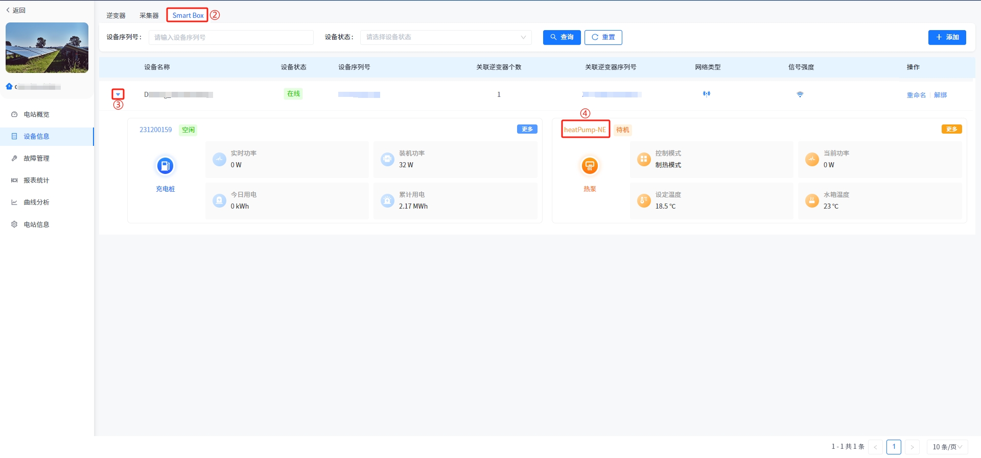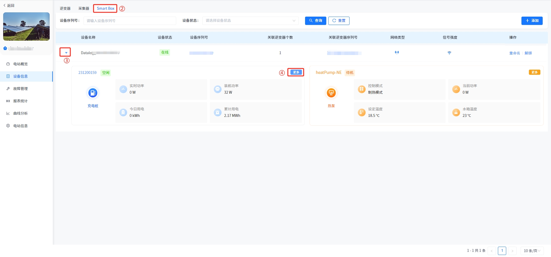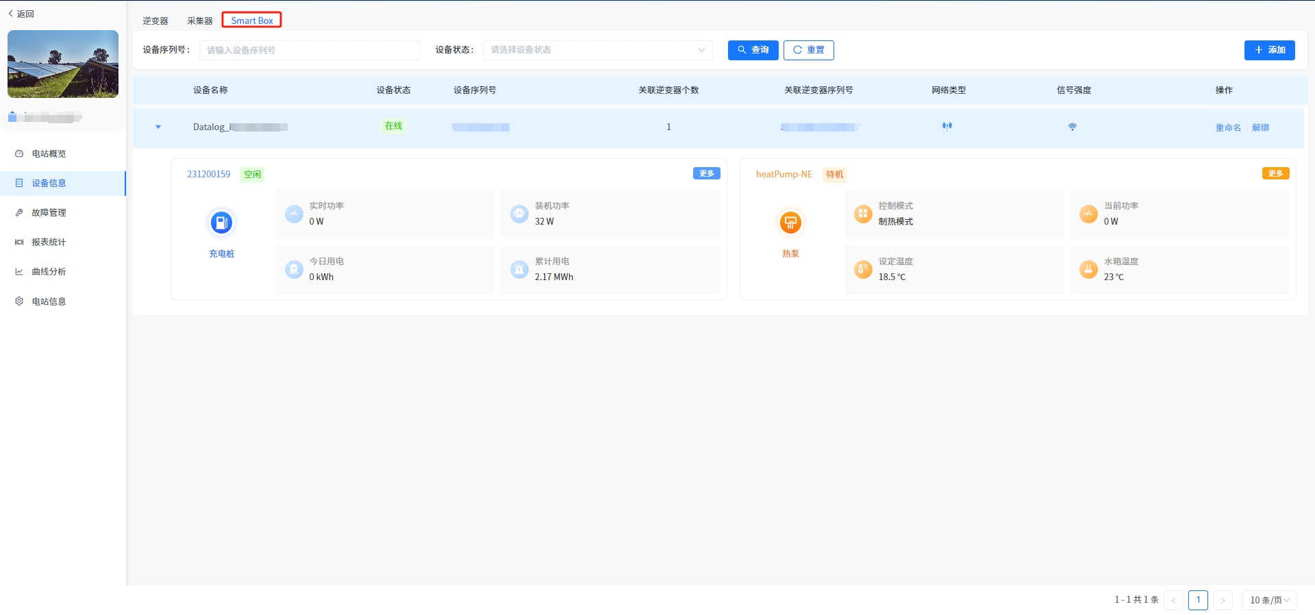 对Smart Box设备进行新增和关联电站的操作,也可以对Smart Box下关联的热泵和充电桩设备进行数据查看、参数配置的操作。Smart Box设备的新增与电站下关联的设备(如逆变器)新增操作一致。参考设备添加步骤。