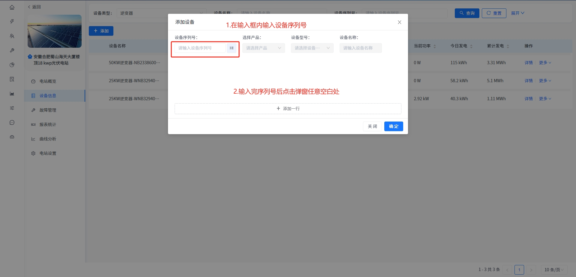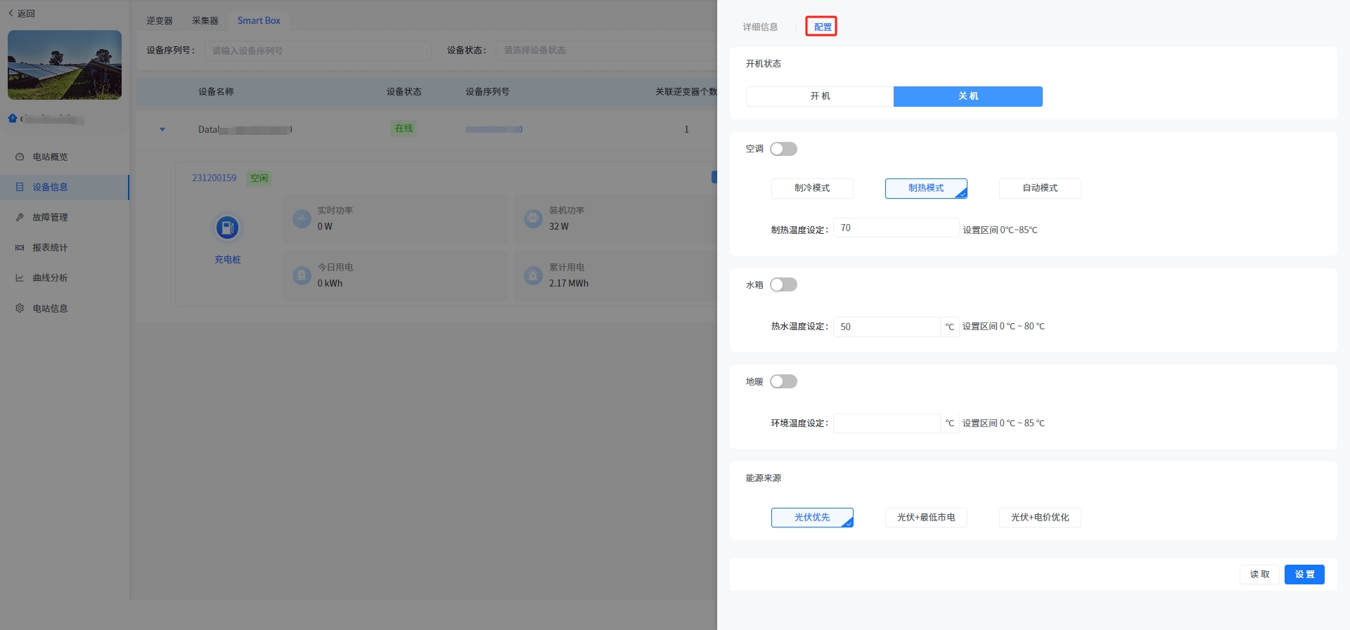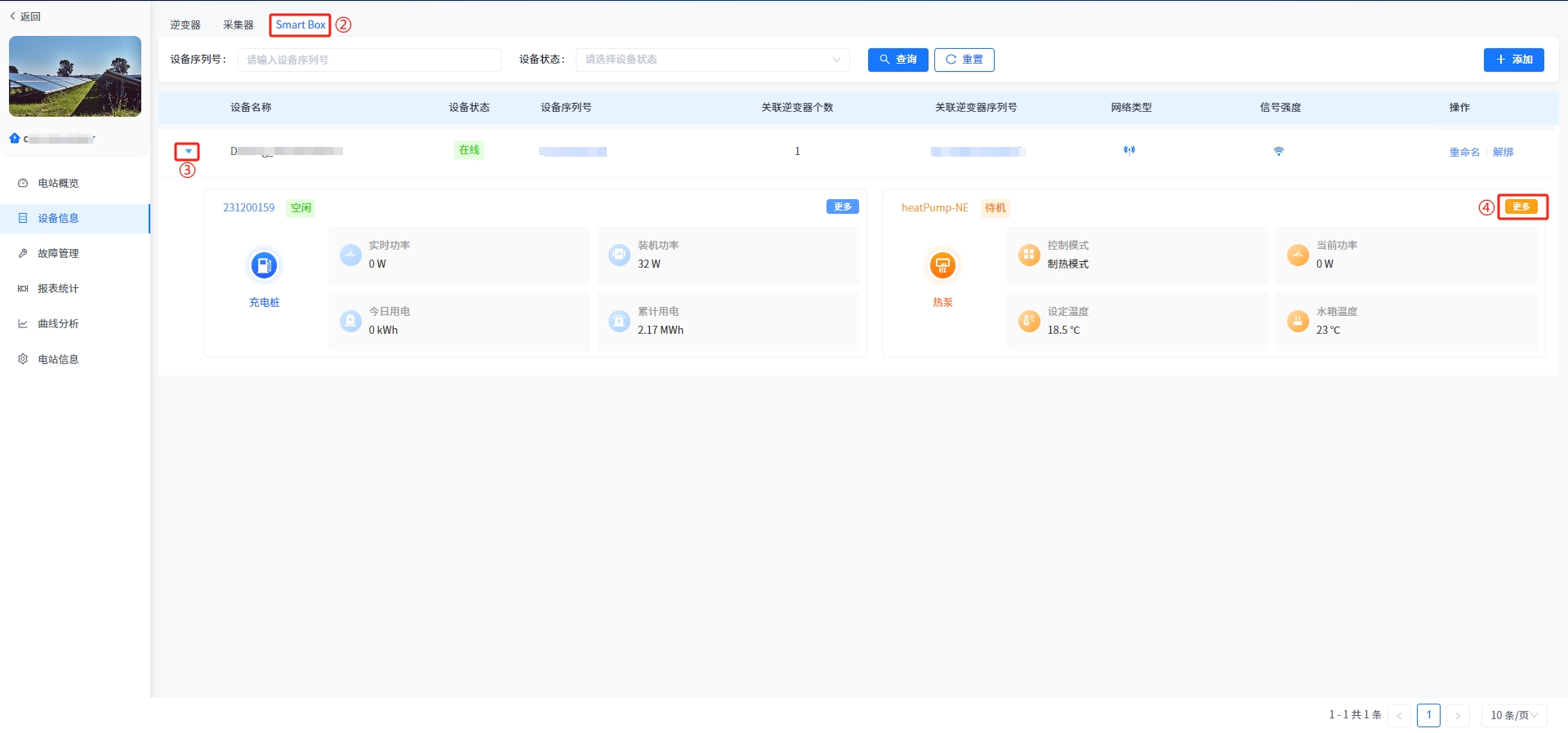 对Smart Box设备进行新增和关联电站的操作,也可以对Smart Box下关联的热泵和充电桩设备进行数据查看、参数配置的操作。Smart Box设备的新增与电站下关联的设备(如逆变器)新增操作一致。参考设备添加步骤。