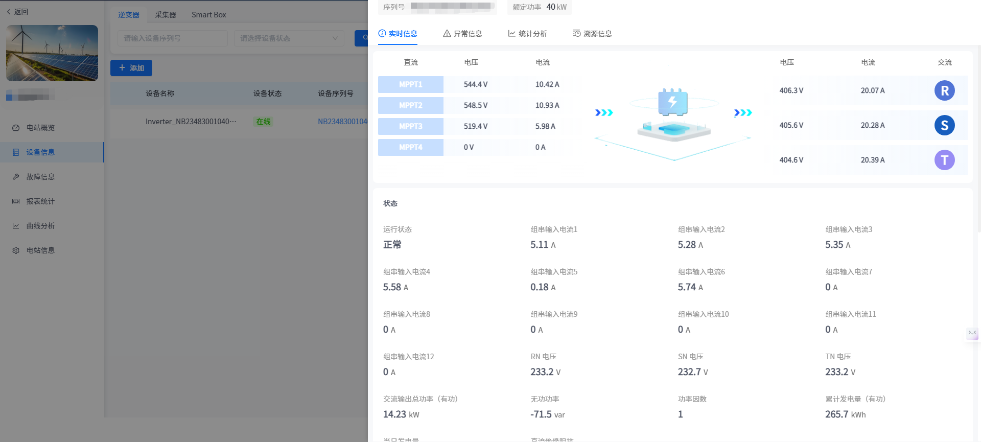 实时信息页面中展示该台设备的详细工作数据,包含:设备状态、发电数据、电网数据、温度、控制和版本号的详细信息(五分钟更新一次)。
