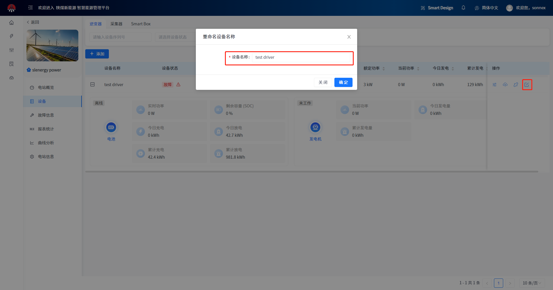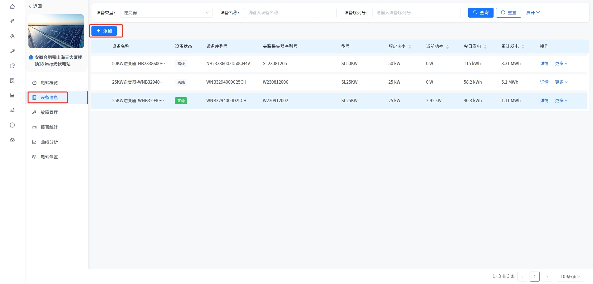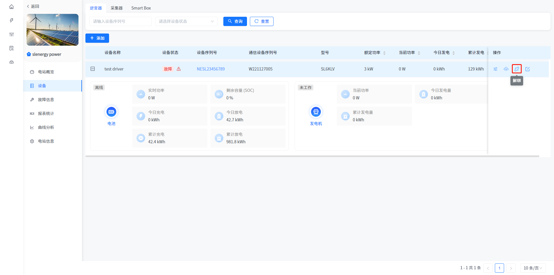 经销商可以对电站关联的设备进行添加、详情查看、配置、重命名和解绑等操作。