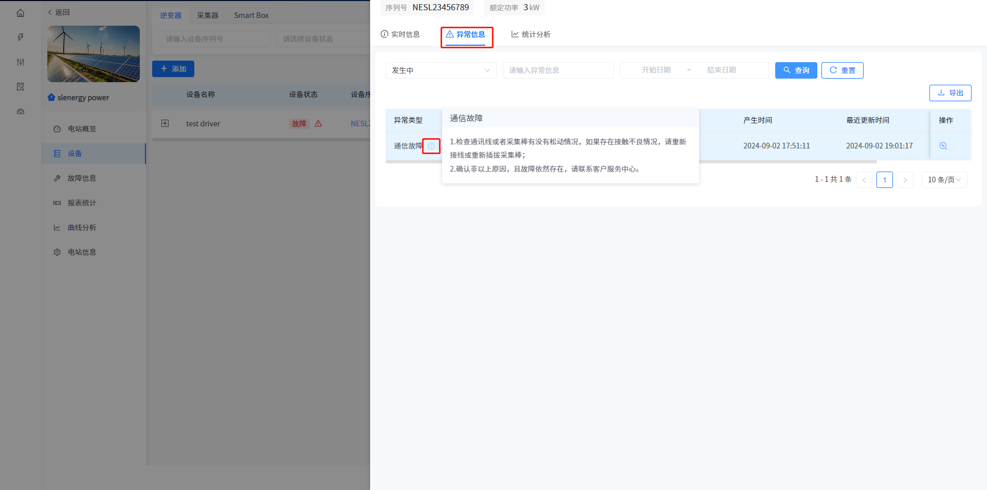 故障信息页面中,展示该台设备所有的故障数据。移动鼠标故障类型旁边的 按钮可以查看到故障告警的排查方案。