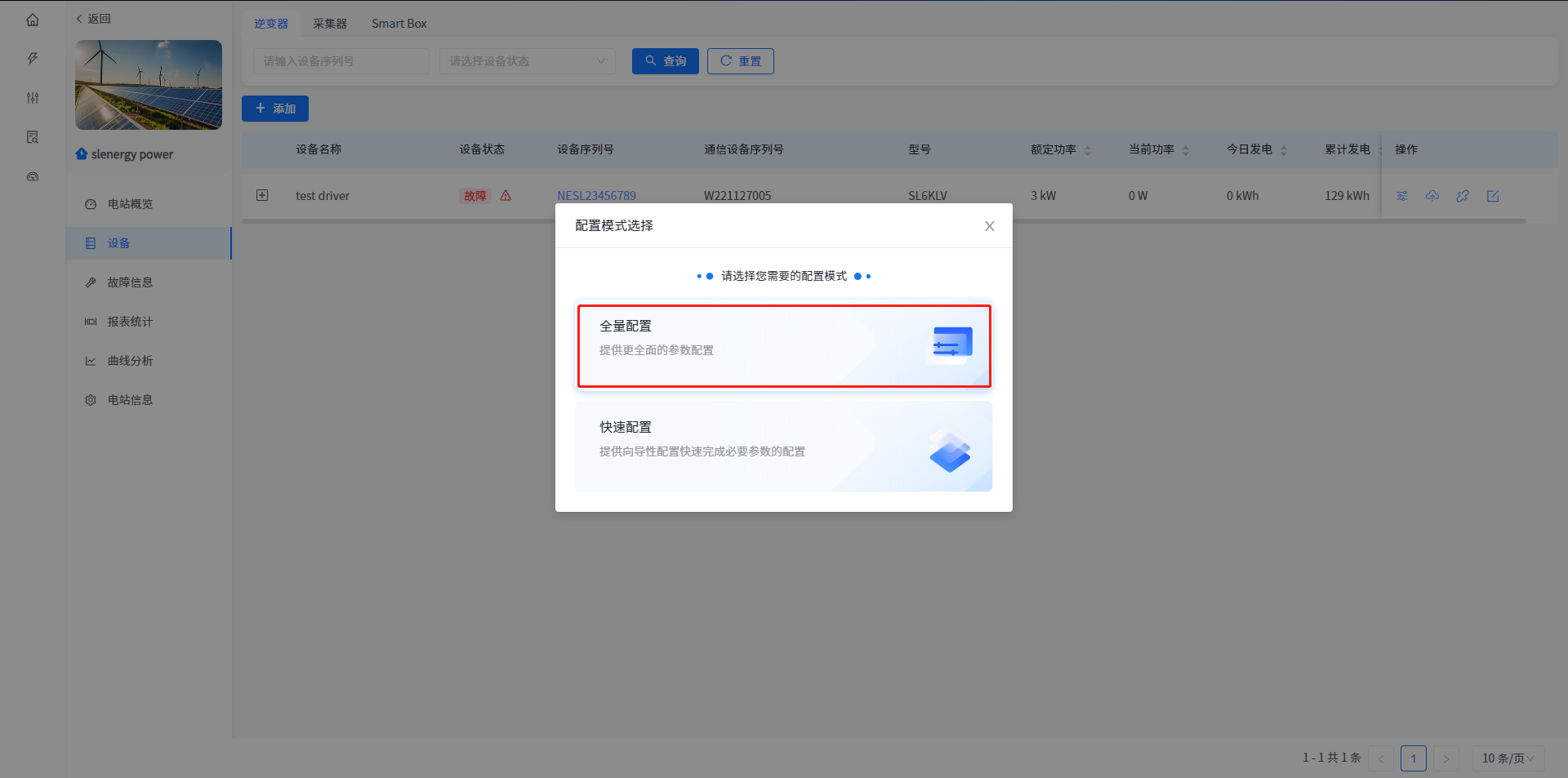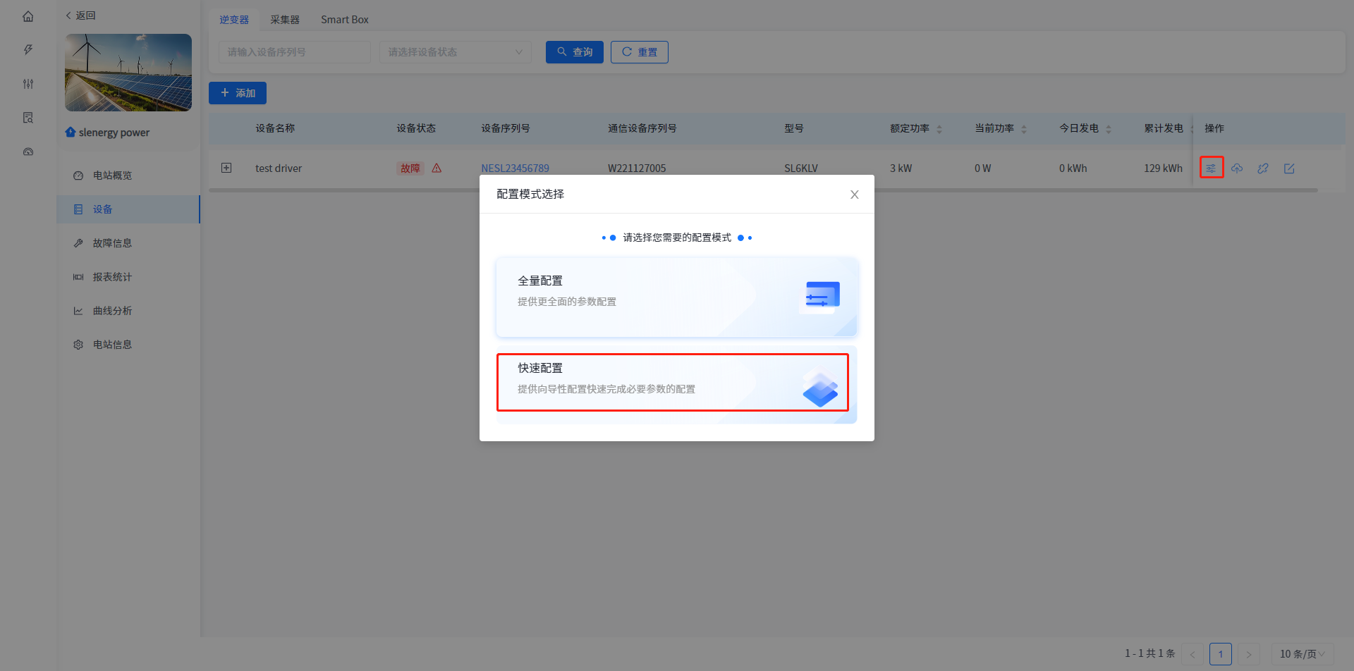 ③ 点击右侧更多-[配置]按钮。(如果该型号设备支持快速配置,那么点击配置按钮之后会弹出配置模式选择弹窗,如果不支持快速配置,那么页面直接进入参数配置页面。)